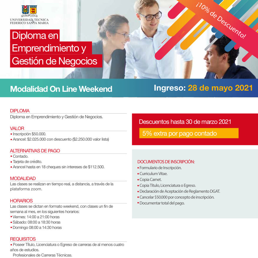 Descuento del 10% por postular hasta 30 marzo para ingreso del 28 de mayo del 2021. Modalidad online weekend.
