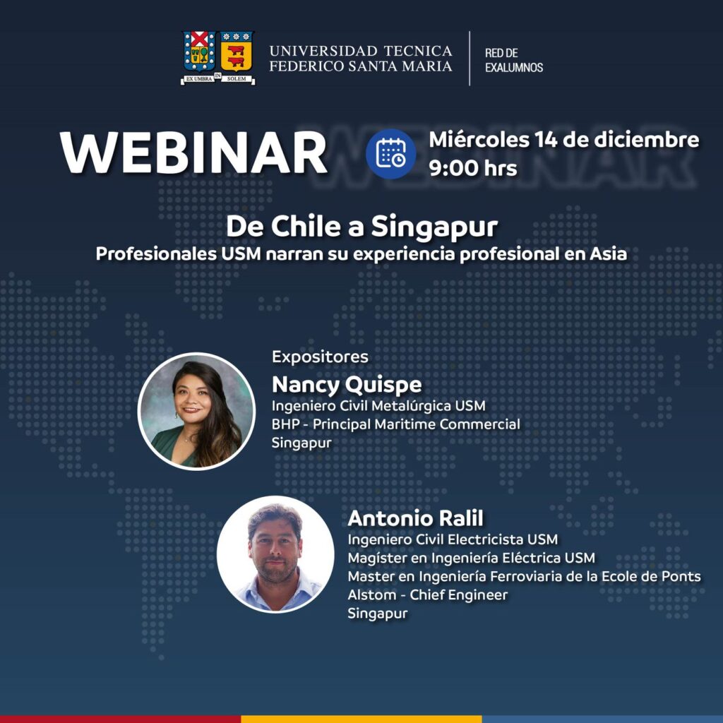 Te invitamos a un entretenido webinar titulado “De Chile a Singapur: Profesionales USM narran su experiencia profesional en Asia”.